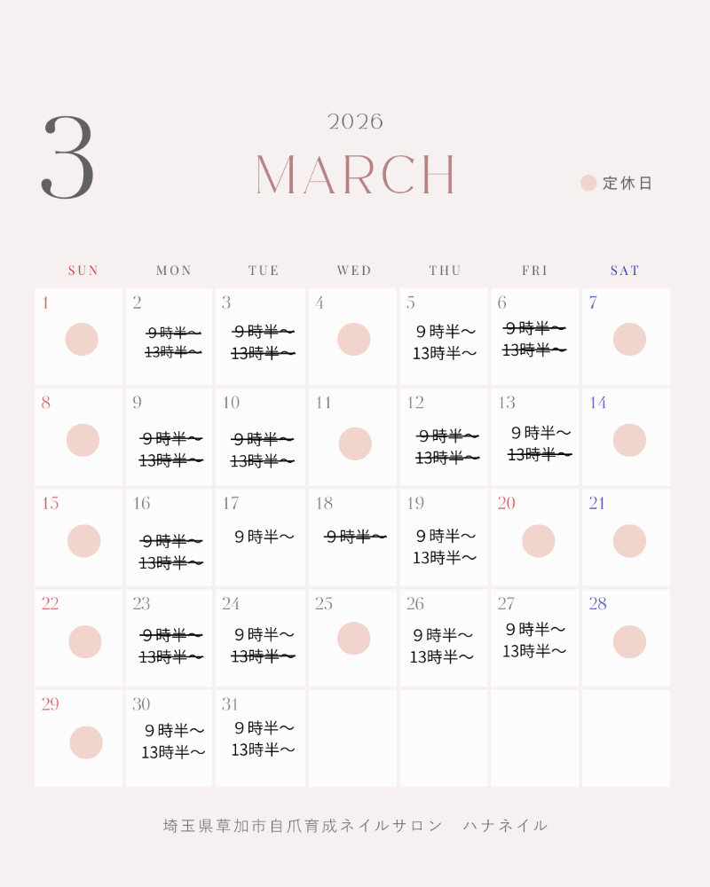 おはようございます🌷埼玉県草加市自爪育成ネイルサロンハナネイルネイリストのゆかです♪三月のご予約状況▼▼▼